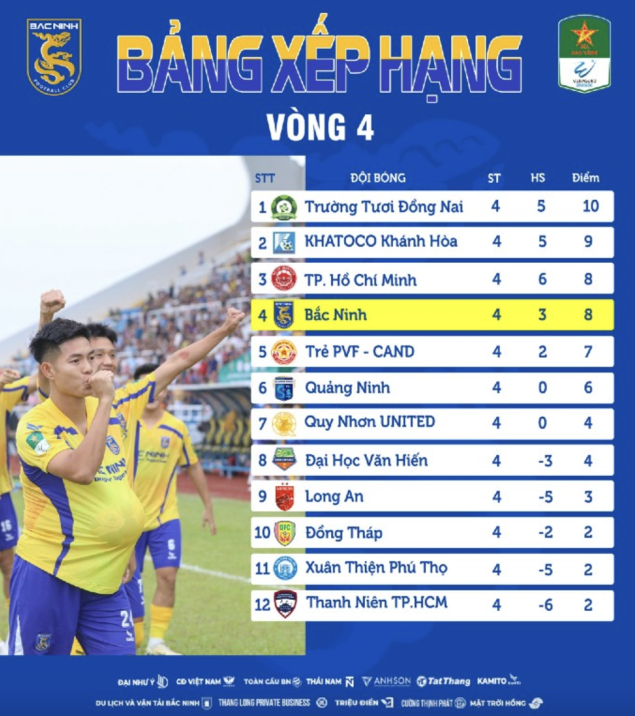 Sau vòng đấu thứ 4, CLB Trường Tươi Đồng Nai tạm chiếm ngôi đầu bảng với 10 điểm. Nhưng khoảng cách mà thầy trò HLV Việt Thắng tạo ra so với các đội bóng phía sau rất mong manh: Hơn đội xếp thứ 2 là Khatoco Khánh Hòa chỉ 1 điểm (10 điểm so với 9 điểm), thậm chí có thể bị san bằng điểm số bởi CLB đang tạm xếp thứ 5 là Trẻ PVF-CAND (7 điểm). Khoảng cách như vậy rất mong manh và cục diện trên BXH sẽ thay đổi nhanh sau mỗi vòng đấu.